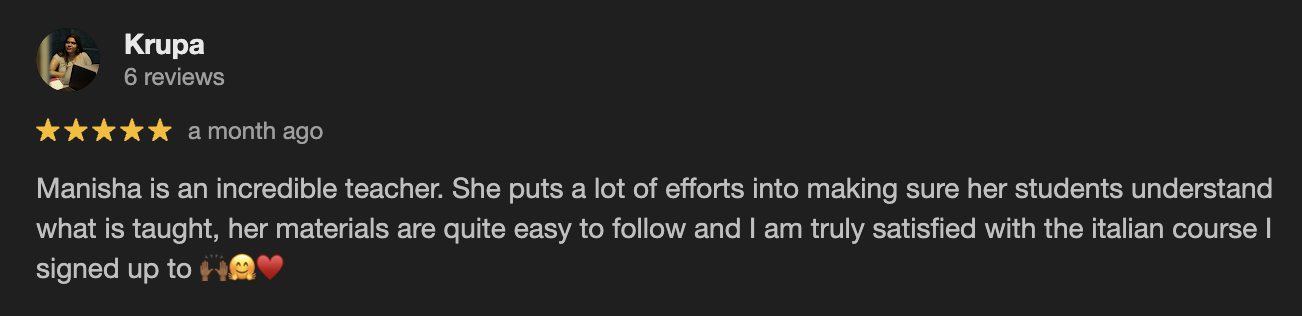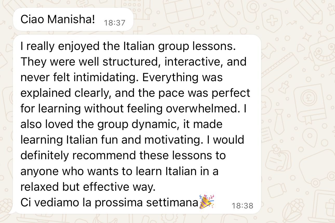 At Italiano con Manisha, lessons are designed to make Italian feel clear, practical, and natural from the very first class. No overwhelming grammar, no boring memorization, just structured lessons, real conversation, and a supportive environment where you can make progress and feel proud of yourself.