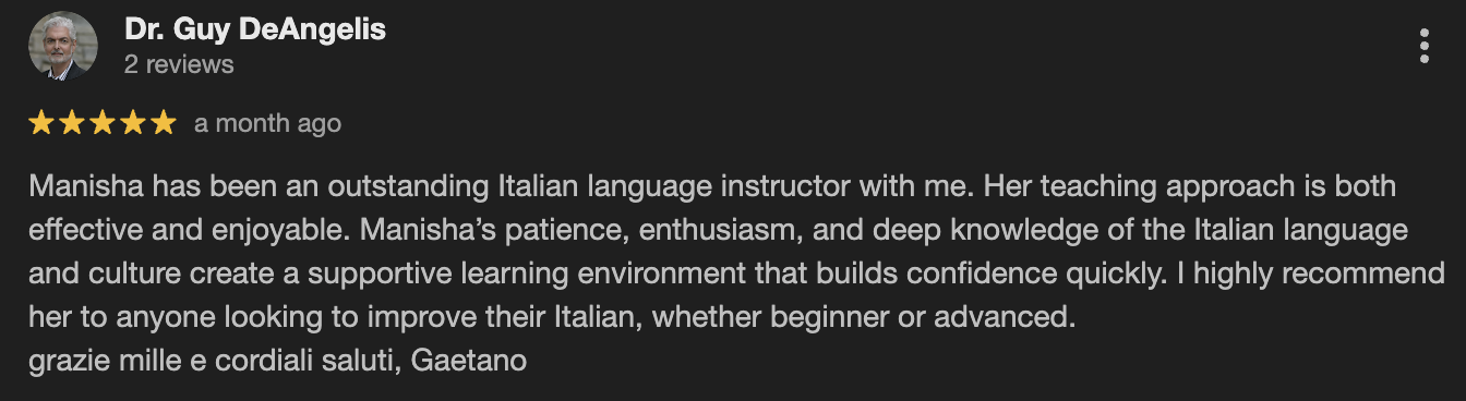Language apps like Duolingo can be a fun starting point, but they don’t teach you how to actually communicate.Italiano con Manisha gives you structure, guidance, and real support