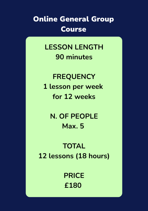 If you’re looking for a complete Italian course that builds every skill you need, this is the one for you. The General Course is a structured group course that develops your speaking, listening, reading, and writing, while also strengthening your grammar and vocabulary.