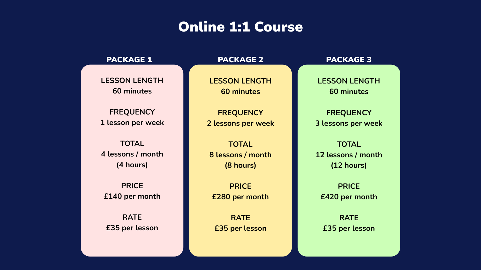 Group courses are planned in advance and have a fixed schedule, so they are non-refundable once started. 1:1 lessons can be rescheduled. We ask students to do so within at least 24 hours’.